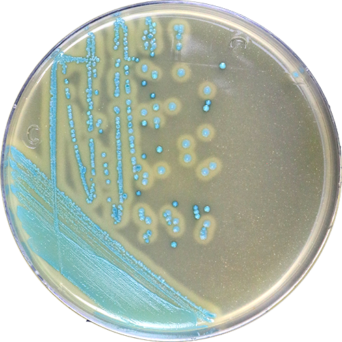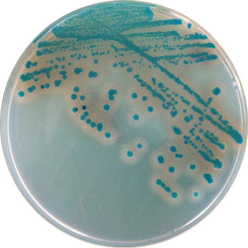 弧菌显色培养基是青岛海博生物公司改良的培养基,用于食品、海产品、病人粪便样品和水产品中副溶血性弧菌的快速检测。副溶血性弧菌显蓝绿色至蓝色,其它弧菌显无色;其它细菌显黄色或无色,且细菌菌落很小。本培养基的特异性高,可以克服TCBS培养基引起的假阴性结果,是一种很理想的快速检测培养基。