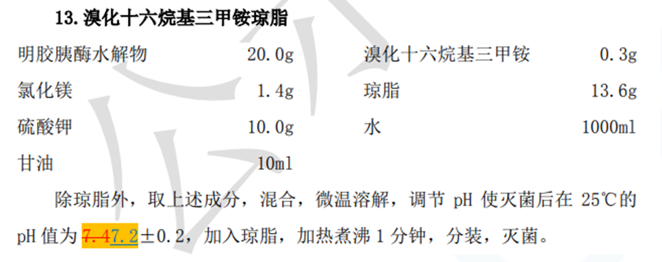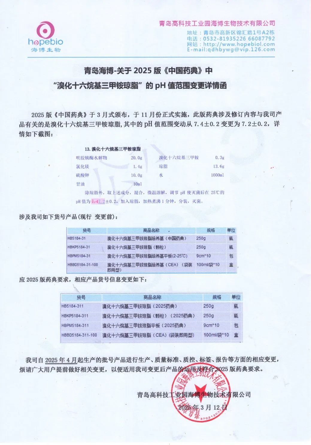 2025 版《中国药典》于3月式颁布,于11月份正式实施,此版药典涉及修订内容与我司产品有关的是溴化十六烷基三甲铵琼脂,其中的 pH 值范围变动从 7.4±0.2变更为 7.2±0.2,详情如下截图: