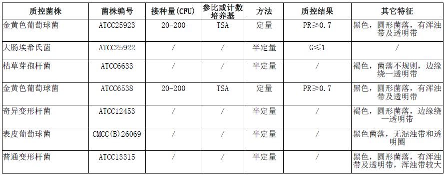 按标签用法制备培养基,接种以下质控菌株,放置36±1℃需氧培养45-48小时。