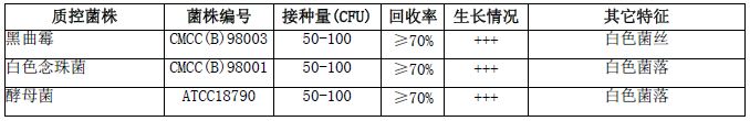 按标签用法制备培养基,接种以下质控菌株,放置23-28℃需氧培养48-72小时。