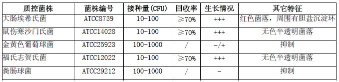 按标签用法制备培养基,接种以下质控菌株,放置36±1℃需氧培养18-24小时。
