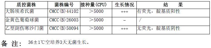 MUG快速鉴定大肠试剂管(5ml)微生物质控结果:
