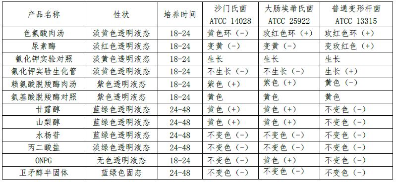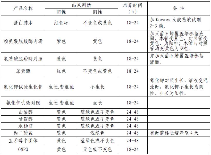 蛋白胨水、尿素酶、氰化钾试验生化管、氰化钾对照、赖氨酸脱羧酶肉汤、氨基酸脱羧酶对照、甘露醇、山梨醇、水杨苷、丙二酸盐、卫矛醇半固体、ONPG。