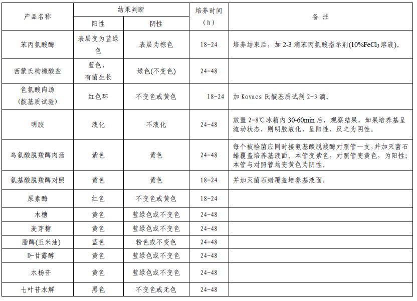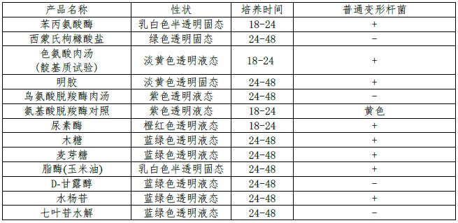 苯丙氨酸酶、西蒙氏枸橼酸盐、色氨酸肉汤(靛基质试验)、明胶、鸟氨酸脱羧酶肉汤、氨基酸脱羧酶对照、尿素酶、木糖、麦芽糖、酯酶(玉米油)、D-甘露醇、水杨苷、七叶苷水解。