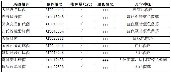 按标签用法制备培养基,接种以下质控菌株,放置30-35℃需氧培养18-24小时。