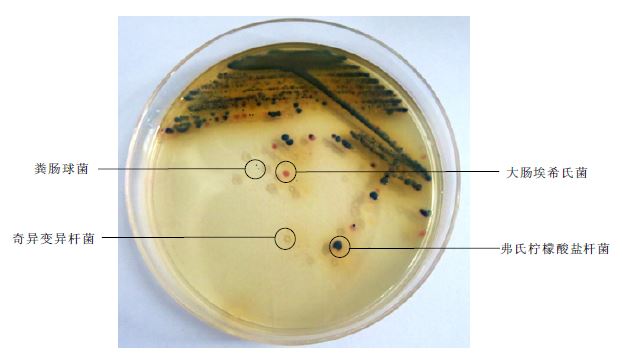 3. 根据平板上不同菌落颜色,分别挑取单菌落进一步生化试验。