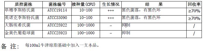 每支添加于225ml HB4186 缓冲李氏菌增菌肉汤基础(BLEB)中 |