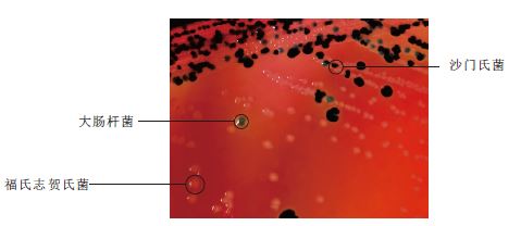 志贺氏菌显白色或无色,有些宋内氏志贺氏菌有蓝色中心;大肠杆菌和大肠菌群显绿色或黄色;沙门氏菌显黄色或无色并有黑色中心;其它细菌显蓝绿色或黄色。变形杆菌和铜绿假单胞菌基本不生长。