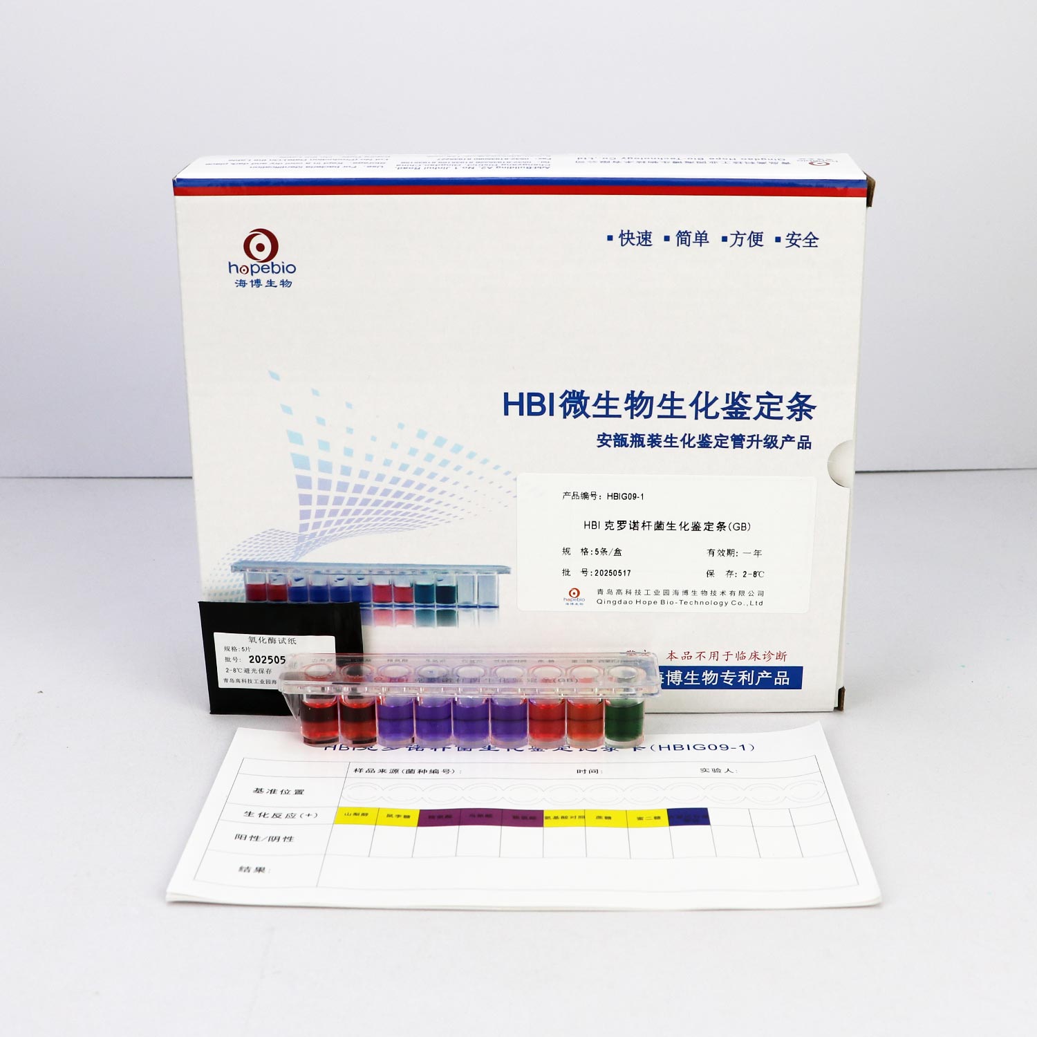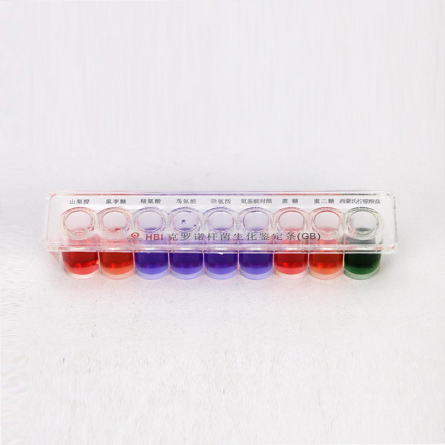 用于克罗诺杆菌(阪崎肠杆菌)的生化鉴定,每条包括:氧化酶试纸,赖氨酸脱羧酶肉汤,鸟氨酸脱羧酶肉汤,L-精氨酸双水解酶,氨酸脱羧酶对照,西蒙氏柠檬酸盐,D-山梨醇,L-鼠李糖,D-蔗糖,D-蜜二糖,共10种生化反应。(GB标准)