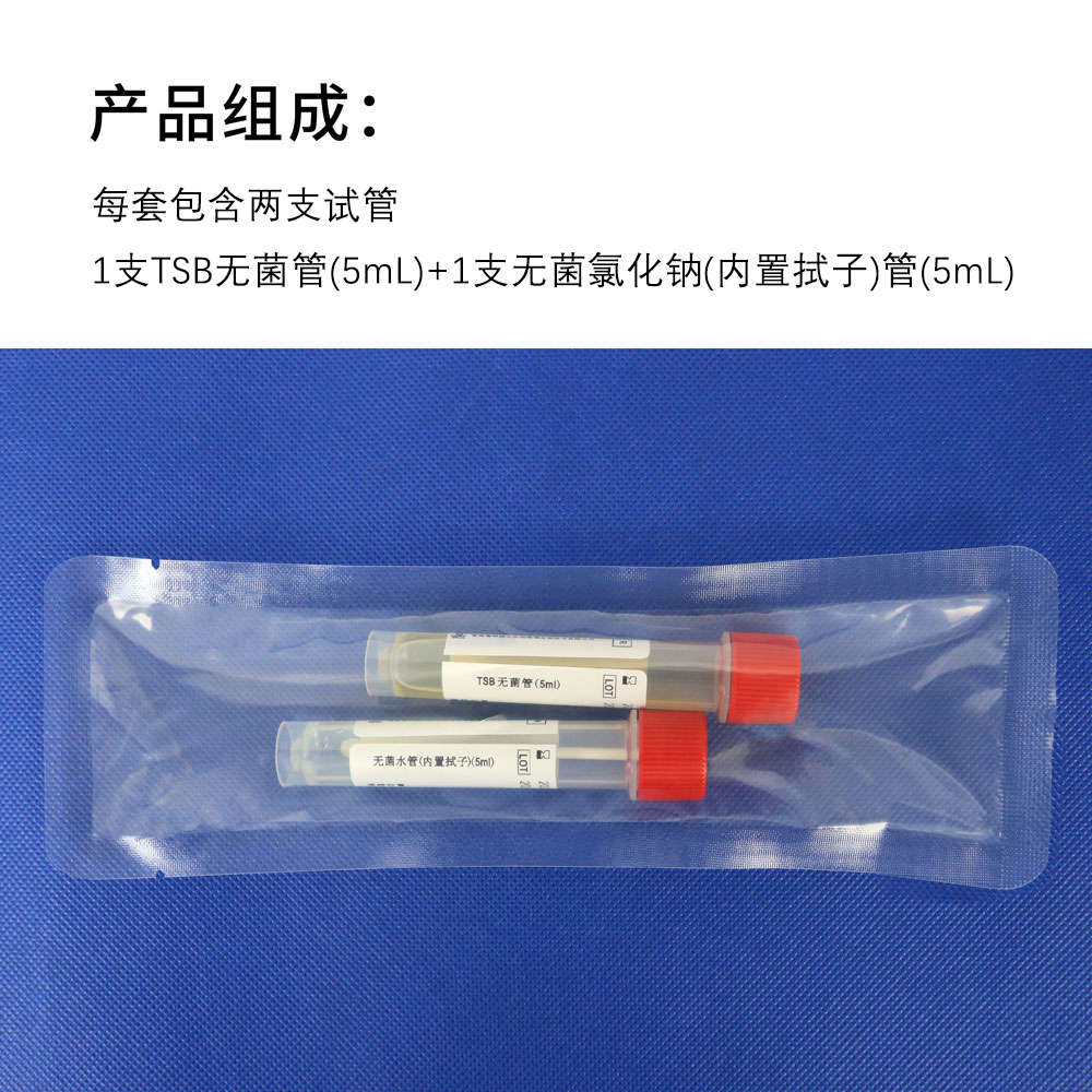 产品组成:每套包含1支TSB无菌管(5mL)+1支无菌氯化钠管(内置拭子)(5mL)。