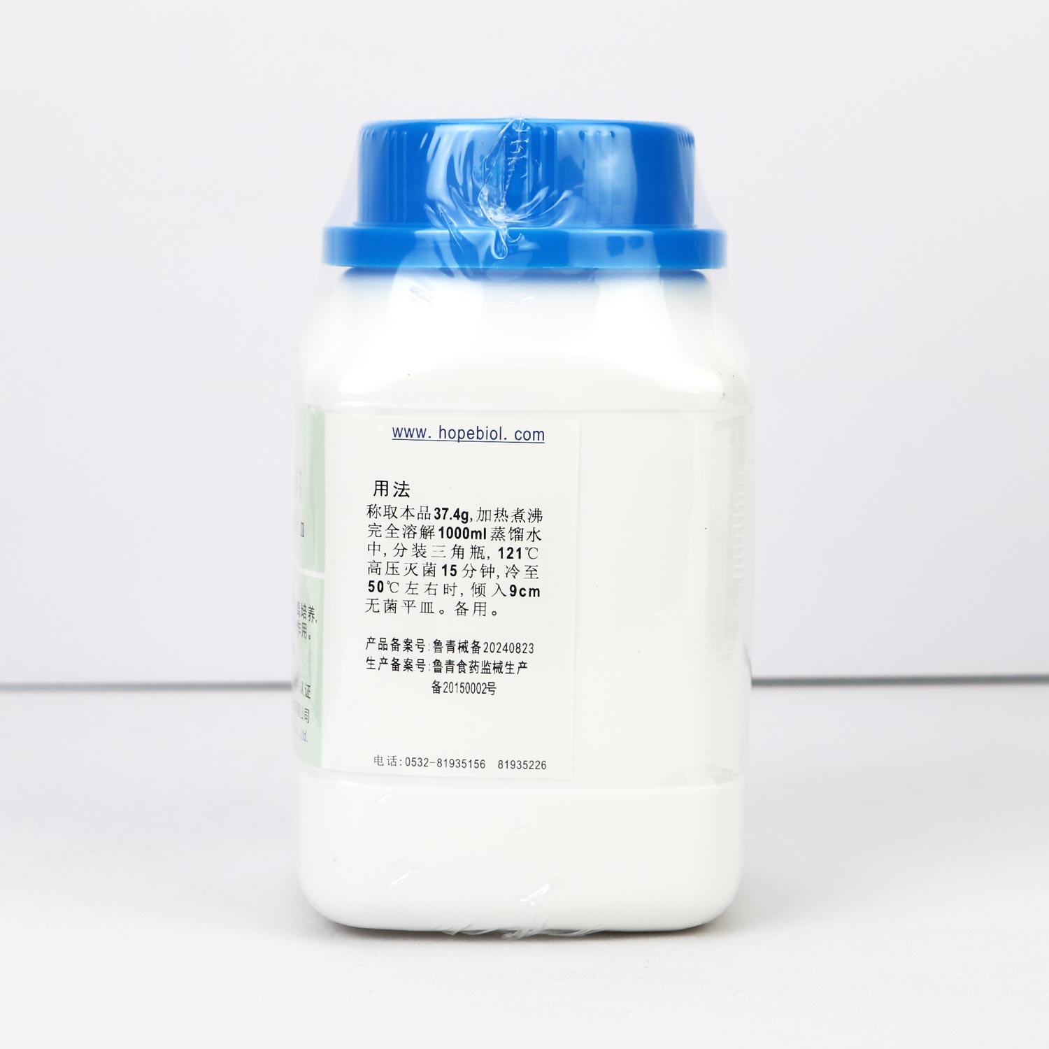 称取本品37.4g,加热煮沸完全溶解1000ml蒸馏水中,分装三角瓶,121℃高压灭菌15分钟,冷至50℃左右时,倾入9cm无菌平皿,备用。