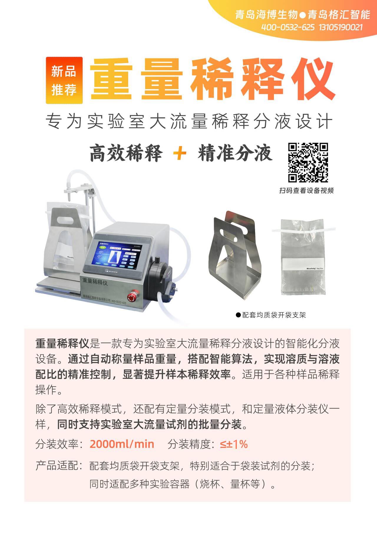 GH-ZLR01重量稀释仪是一种配备高精度蠕动泵和称重传感器的批量分液仪器,能够快速、精准的完成样品稀释操作。具有重量稀释功能、定量分装功能、手持分装功能、清洗功能四种功能。