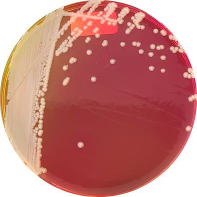 2. 麦康凯琼脂平板:浅黄褐色圆形菌落,表面光滑,周围培养基通常因产碱变为橙黄色(图2)。
