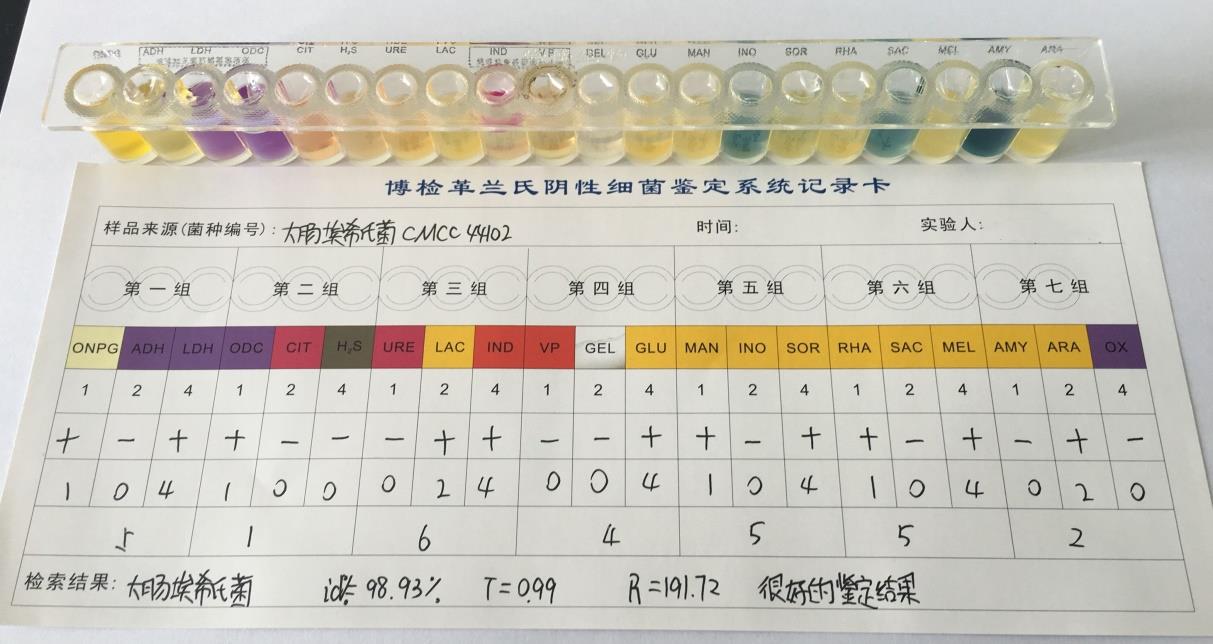 3.博检革兰氏阴性细菌鉴定系统生化检测:大肠埃希氏菌。
