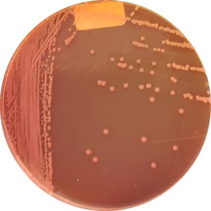 麦康凯琼脂平板:浅黄褐色圆形菌落,表面光滑,周围培养基通常因产碱变为橙黄色(如图1-B)。