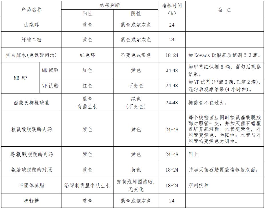 取初步生化试验后的可疑菌落,划线接种到营养琼脂平板进行纯化培养(36±1℃培养18-24h),取纯化菌落做氧化酶试验和接种山梨醇、纤维二糖、蛋白胨水(色氨酸肉汤)、MR-VP、西蒙氏柠檬酸盐、赖氨酸、鸟氨酸、氨基酸脱羧酶对照、半固体琼脂、棉子糖。本成套生化鉴定管不含三糖铁琼脂。请参照 SN/T0973标准判断结果。