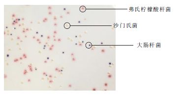 大肠杆菌典型菌落为蓝色至紫色,大肠菌群为粉红色菌落,其它细菌为无色菌落。