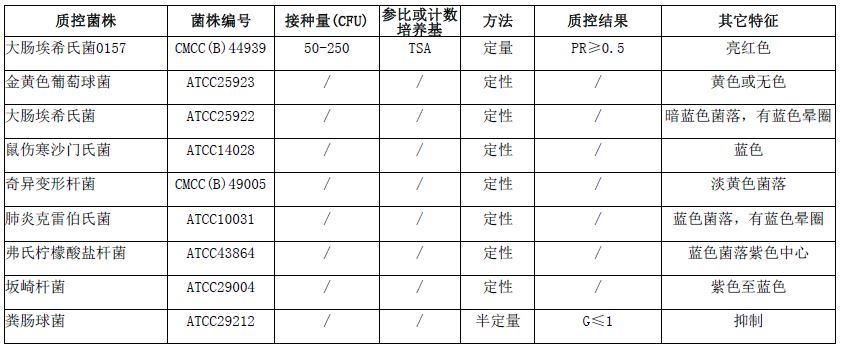 按标签用法制备培养基,接种以下质控菌株,放置36±1℃需氧培养18-24小时。