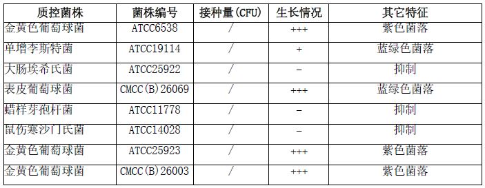 按标签用法制备培养基,接种以下质控菌株,放置36±1℃需氧培养18-24小时。