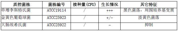 按标签用法制备培养基,接种以下质控菌株,放置36±1℃需氧培养24-48小时。