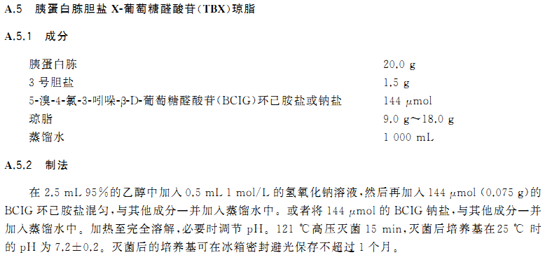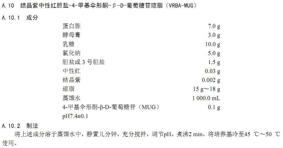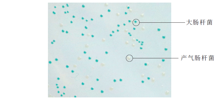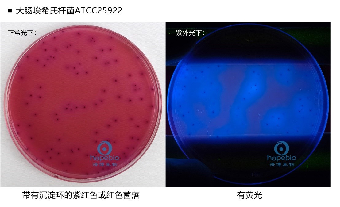 在TBX培养基中,大肠埃希氏菌具有β-葡萄糖醛酸苷酶活性,能分解5-溴-4-氯-3-吲哚-β-D-葡萄糖醛酸苷,在TBX琼脂上形成蓝绿色菌落,对其进行平板计数和鉴定。在VRBA-MUG培养基中,大肠埃希氏杆菌含有的β-葡萄糖醛酸苷酶作用于4-甲基伞形酮-β-D葡萄糖醛酸苷(4-Methylumbellifery-β-D-Glucuronide简称MUG)的β糖醛酸苷键,使其水解,释放的4-甲基伞形酮在366nm紫外灯下产生蓝白色荧光,然后进行平板计数。