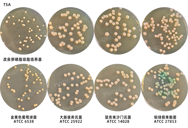 2、以10倍梯度稀释法制备质控菌株菌悬液,吸取适宜梯度的菌悬液接种于待测培养基和参比培养基(HB0177-8胰蛋白胨大豆琼脂(TSA))。