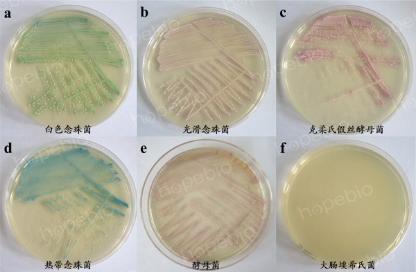 如青岛海博生物的念珠菌显色培养基(货号HB7015):白色念珠菌生成绿色菌落;热带念珠菌生成蓝灰色菌落;光滑念珠菌生成淡紫色-紫色菌落;克柔念珠菌(即图中的克柔氏假丝酵母菌)生成紫粉色菌落;酵母菌生成灰粉色菌落;其他念珠菌生成白色菌落;细菌(如大肠埃希氏菌)被抑制而不生长,如图1所示。该显色培养基对不同念珠菌种类进行了区分,并且其选择性抑制能力使肠杆菌科污染率降至接近于零,可见其显著优于传统方法。