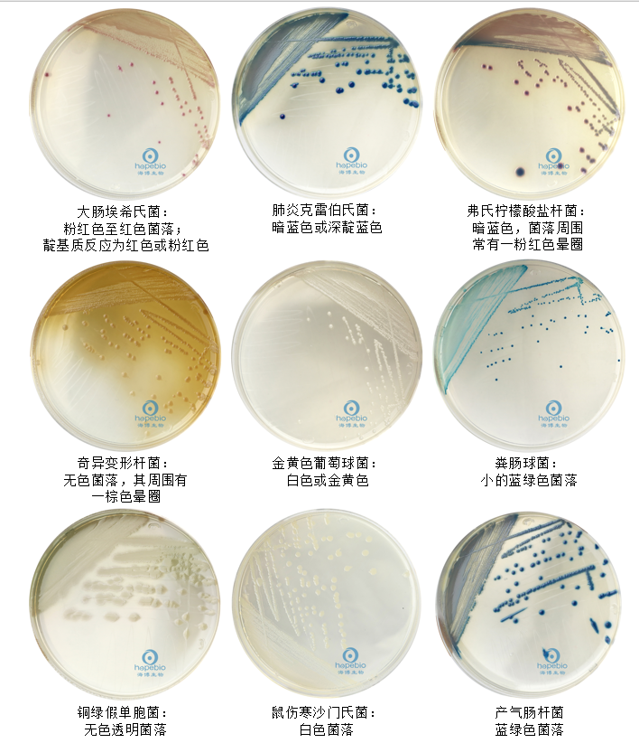 用于阪崎肠杆菌的显色培养, 阪崎肠杆菌显蓝色,其它肠杆菌显无色 |