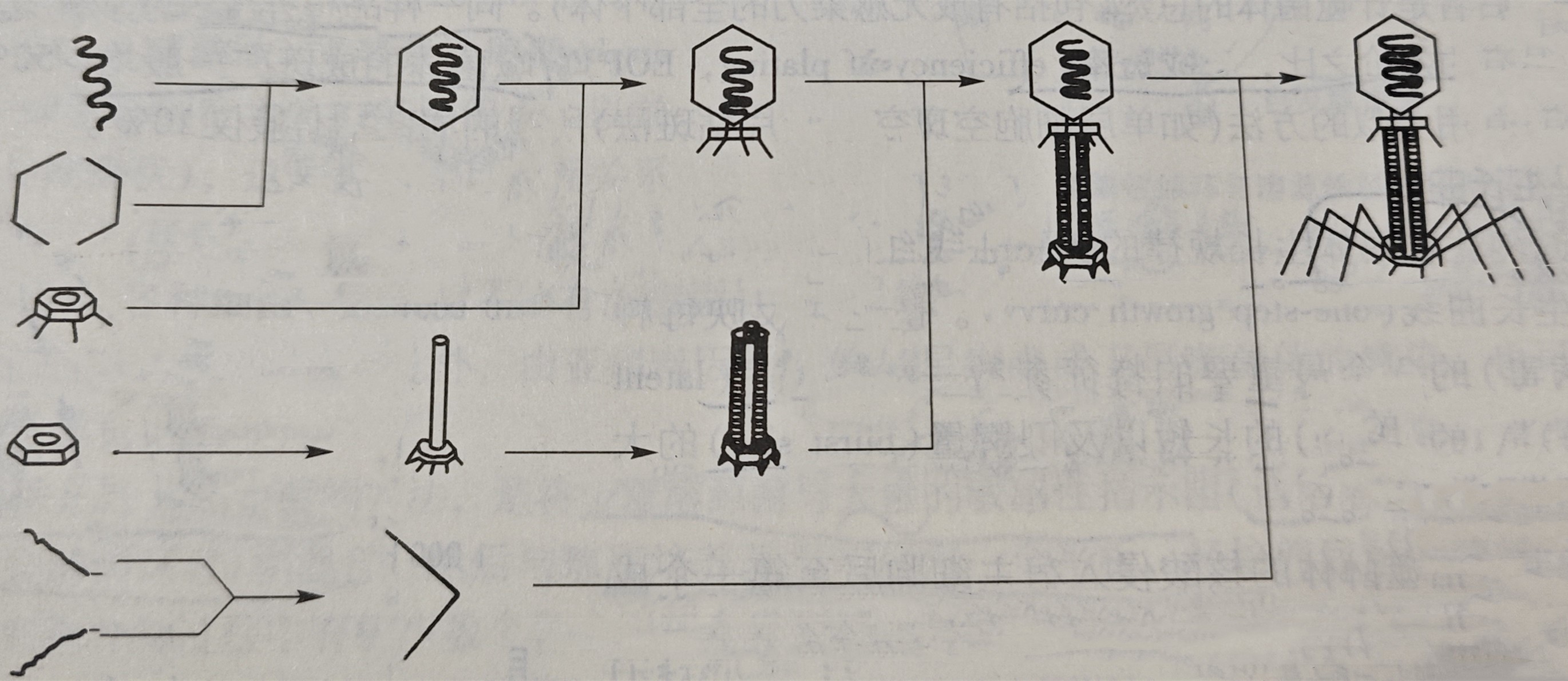 图2 噬菌体装配过程模式图(图片引自周德庆,微生物学教程第3版)[1]