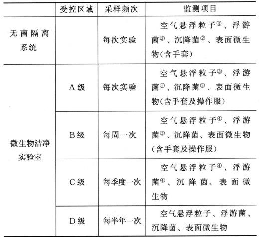 注:①每月一次。②工作台面沉降菌的日常监测采样点数不少于3个,且每个采样点的平皿数应不少于1个。③每季度一次。④每半年一次。