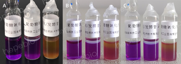注意事项:由于不同的伯克霍尔德菌葡萄糖氧化能力不同,氧化产酸的速度不同,因此该试验培养时间至少3天,且每天上午下午各观察一次,只要生化管出现变黄即为阳性,以免菌株利用培养基中的营养物质产碱使培养基变回原来的紫色,做出错误的判断,如图3和图4所示。