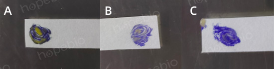 用玻璃棒或一次性接种针挑取单个特征性菌落,涂布在氧化酶试剂湿润的滤纸平板上。洋葱伯克霍尔德菌为迟缓型氧化酶阳性(紫红色、紫色或深蓝色),反应时间约为2min~10min,如图8所示。