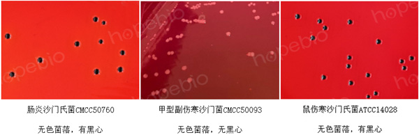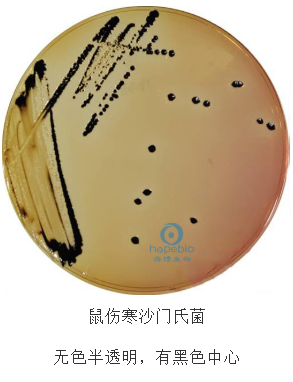 (3)沙门氏菌在HE琼脂上,36℃±1℃培养18h-24h,典型菌落特征为无色透明菌落有或无黑色中心。