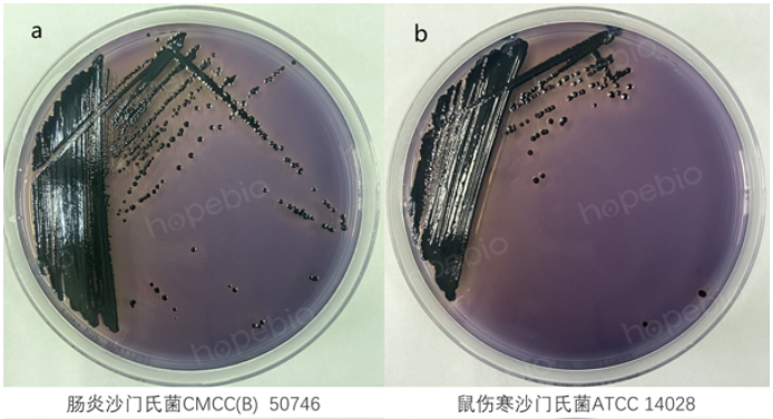 (3)沙门氏菌在MLCB寒天培地培养基上,36℃±1℃培养18h-24h,典型菌落特征为黑色中心菌落。