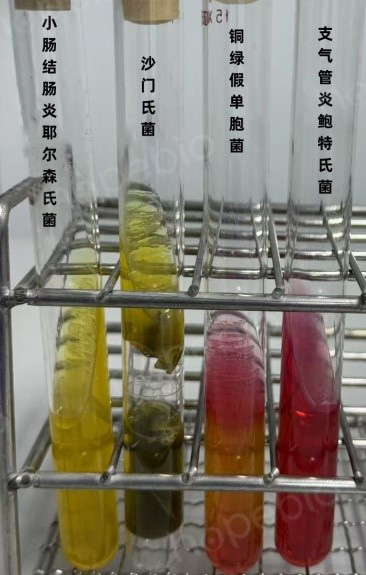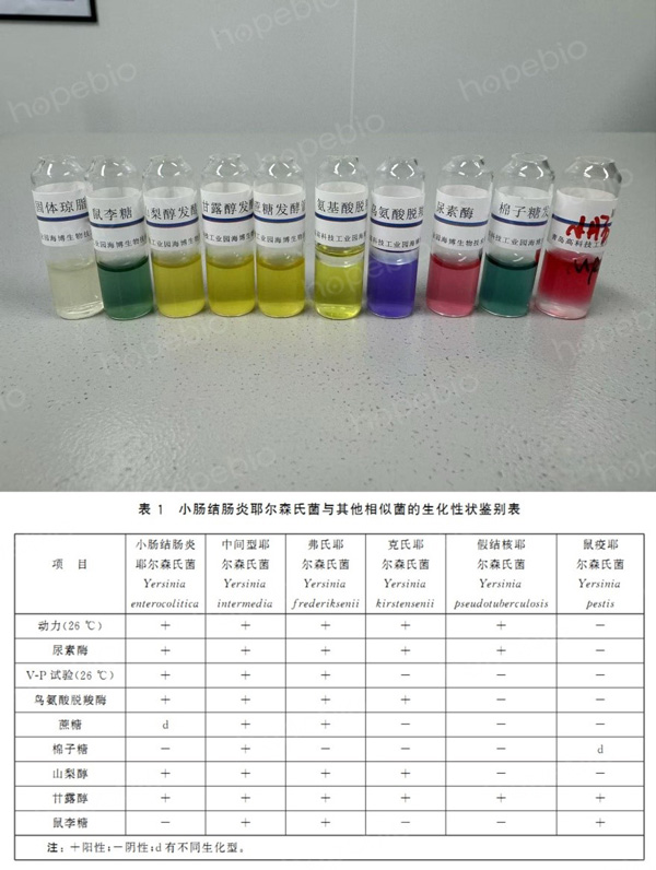 用接种环挑取可疑培养物,进行生化鉴定(小肠结肠炎耶尔森氏菌成套生化鉴定管)