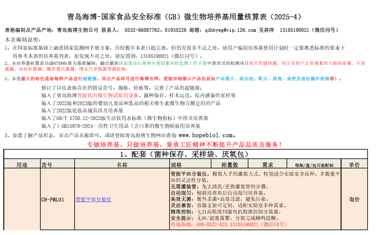青岛海博(2025)--国家食品安全标准(GB)微生物培养基用量核算表