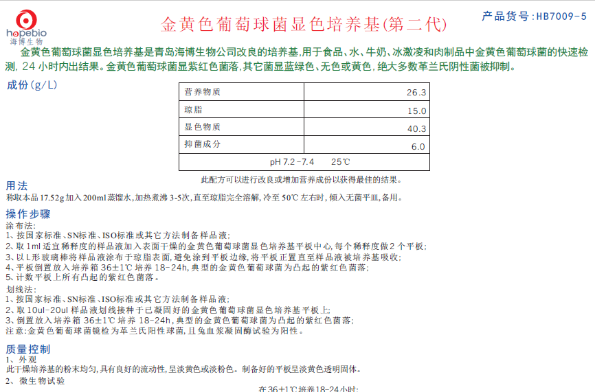 HB7009-5 金黄色葡萄球菌显色培养基(第二代)说明书